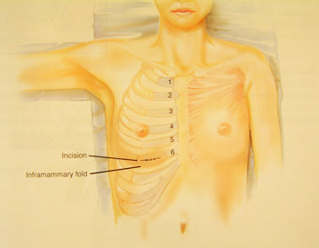 局麻下在乳房轮廓线下(女性)或第七肋软骨表面取2-3cm长切口,显露软骨膜,剥开骨膜,切取所需长度(一般4cm—5cm)肋软骨。按鼻根点及