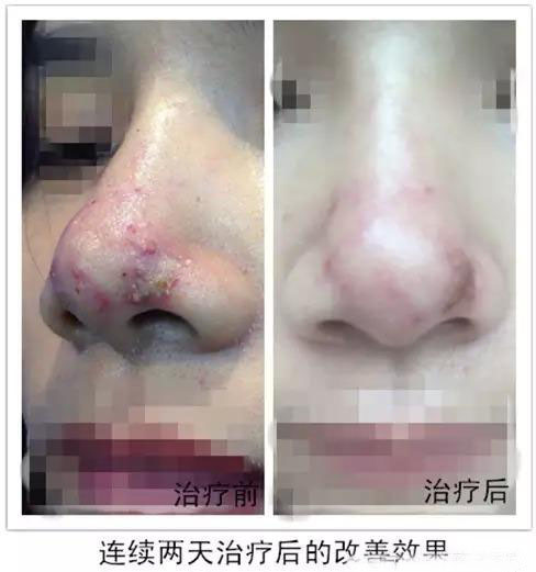 经过两天连续的治疗,小美鼻头、鼻翼等部位的红肿、脓包问题,已经有了较为明显的改善。尤其是左侧鼻翼的化脓部位,已经开始结痂。鼻部皮肤的红肿症状开始淡化,感染的现象得到抑制。