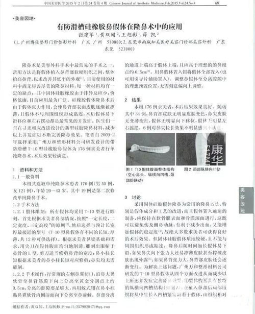 论文对176例T10隆鼻求美者进行术后跟踪,随访的案例鼻背部皮肤无明显变色,鼻尖皮肤无变薄变红,假体无明显向下移位,假体无明显左右摇摆,术后效果良好。由此可见,T10鼻假体优于普通的鼻假体,能有效预防隆鼻术后鼻假体下滑移位和摆动的常见并发症。“T10是一款符合人机工程学的鼻假体,是目前值得推广使用的较理想的隆鼻术材料”。